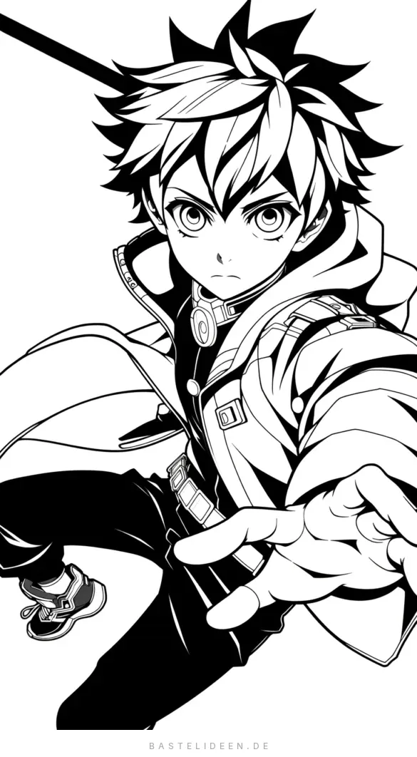 Das Bild zeigt einen actiongeladenen Anime-Krieger in einer dynamischen Pose, bereit für den Kampf. Mit stacheligen Haaren, intensiven Augen und einem entschlossenen Gesichtsausdruck ist dieser Charakter in ein detailliertes Outfit gekleidet.