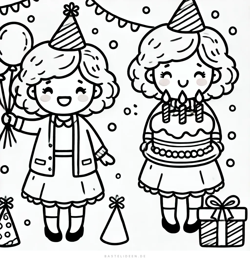 Auf diesem niedlichen Ausmalbild zum Geburtstag sehen wir zwei fröhliche Omas, die ihren großen Tag feiern. Eine hält ein Bündel Ballons, während die andere einen festlichen Kuchen mit Kerzen präsentiert – perfekt für jede Geburtstagsparty.