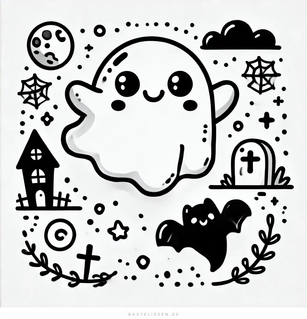 Dieses süße Geist-Ausmalbild bringt Halloween-Spass mit einem freundlichen Geist, der von klassischen Halloween-Symbolen umgeben ist, darunter ein Spukhaus, eine Fledermaus, Grabsteine und Spinnennetze.