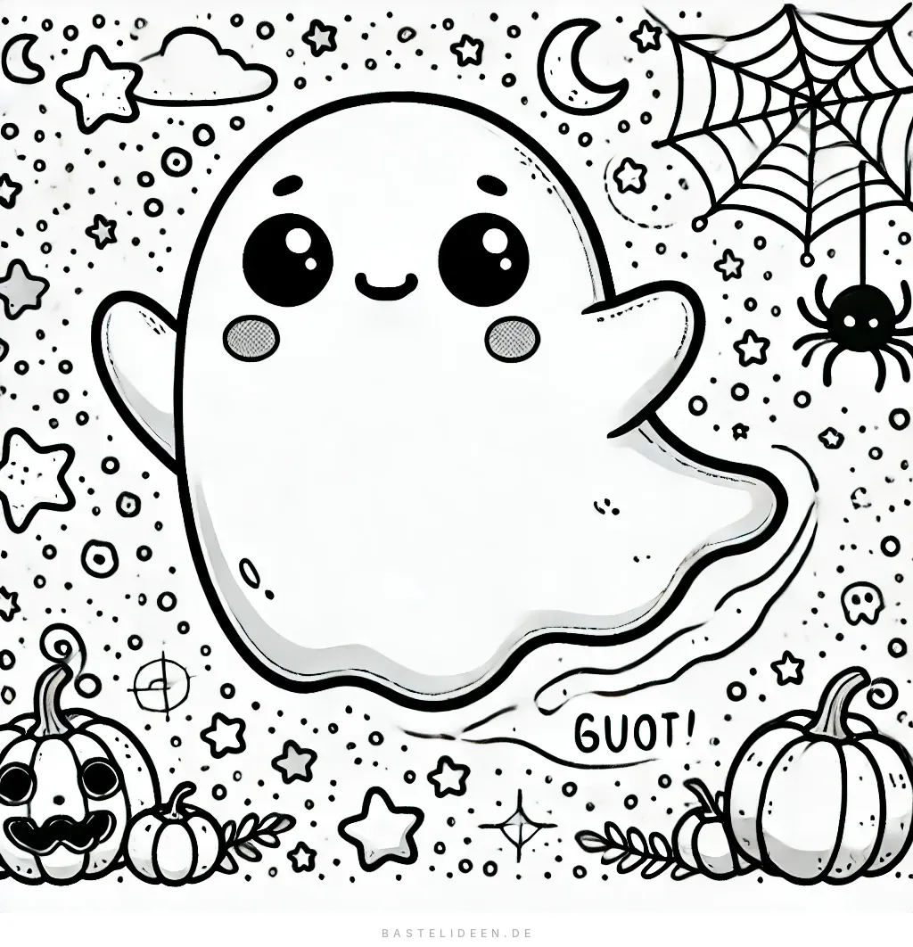 Dieses niedliche Geist-Ausmalbild ist perfekt für Kinder und Erwachsene, die eine spielerische Halloween-Stimmung mögen. Ein freundlicher Geist mit großen Augen und fröhlichem Gesichtsausdruck schwebt zwischen Kürbissen, Sternen, Halbmond und einem Spinnennetz.