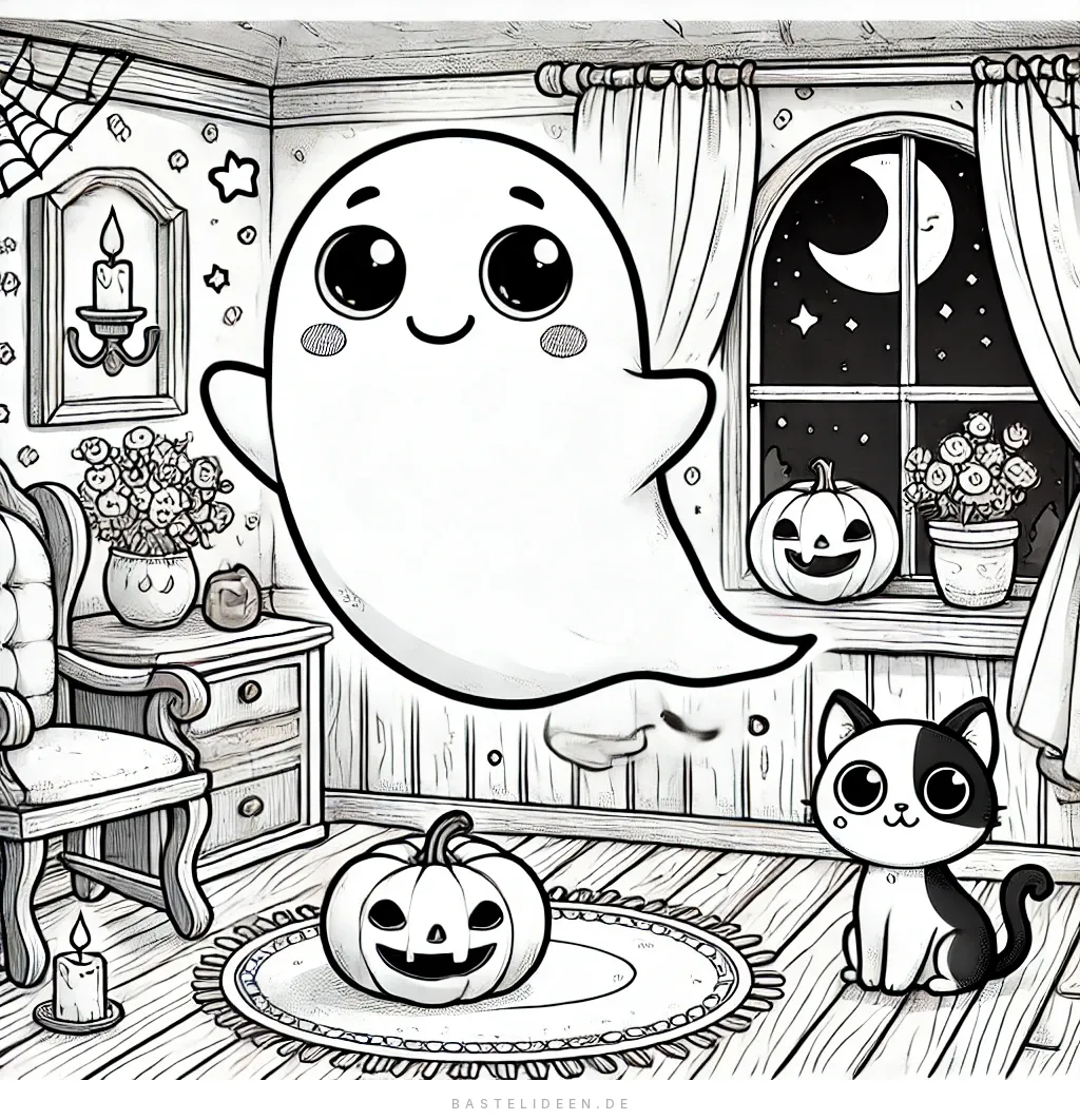 Dieses charmante Ausmalbild zeigt einen freundlichen Geist, der in einem gemütlichen, leicht gruseligen Zimmer schwebt. Ein fröhliches Kürbisgesicht schaut durchs Fenster, während eine süße Katze und sanftes Kerzenlicht die Szene erwärmen.