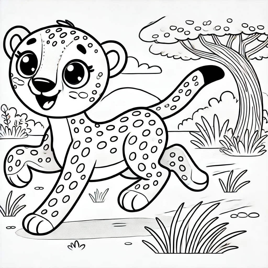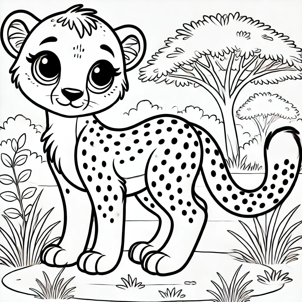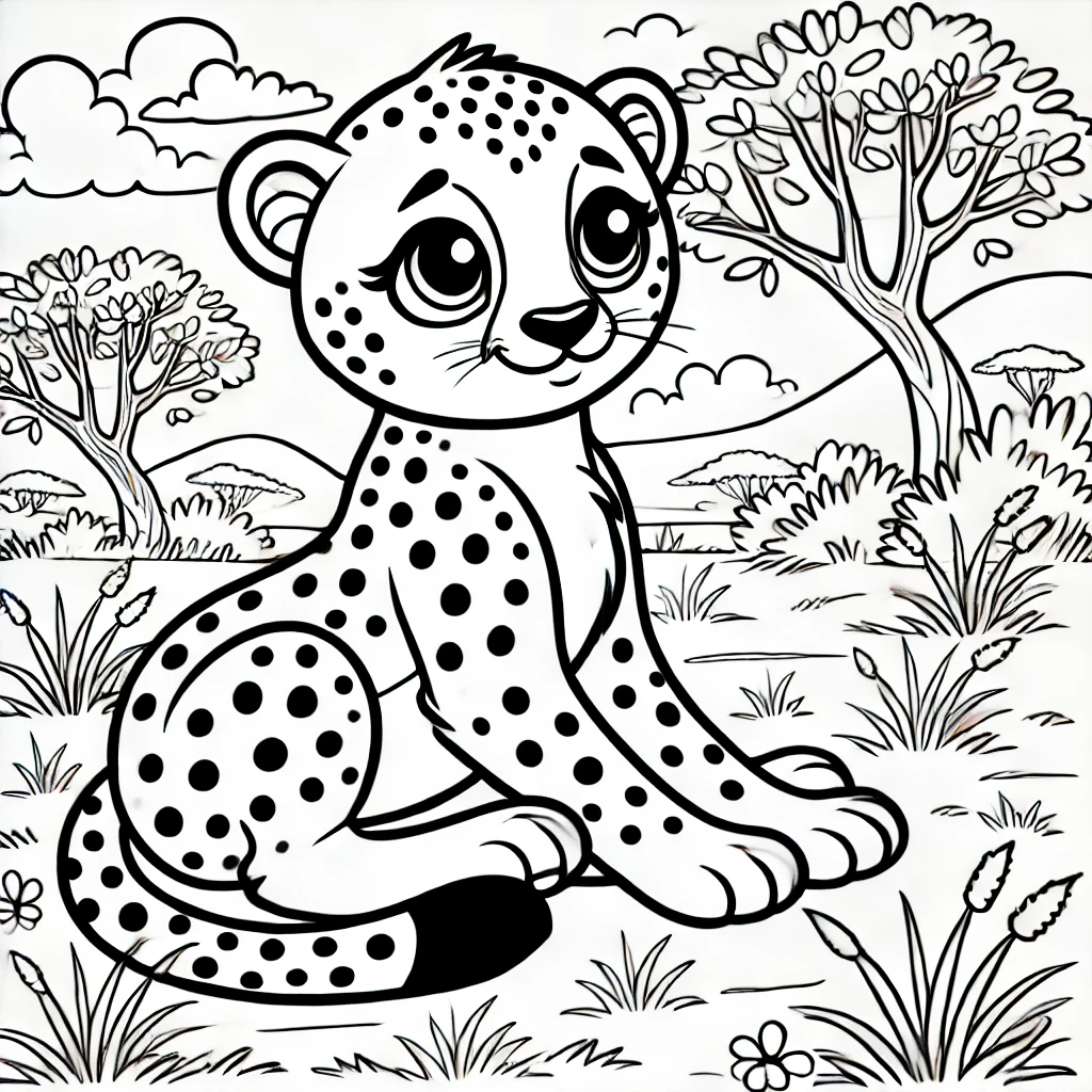 Diese niedliche Gepard-Malvorlage zeigt einen verspielten, cartoonartigen Geparden in einer malerischen Kulisse. Mit großen, ausdrucksstarken Augen und einem charmanten Lächeln ist dieser kleine Gepard ideal für Kinder und alle, die süße Tierzeichnungen lieben.
