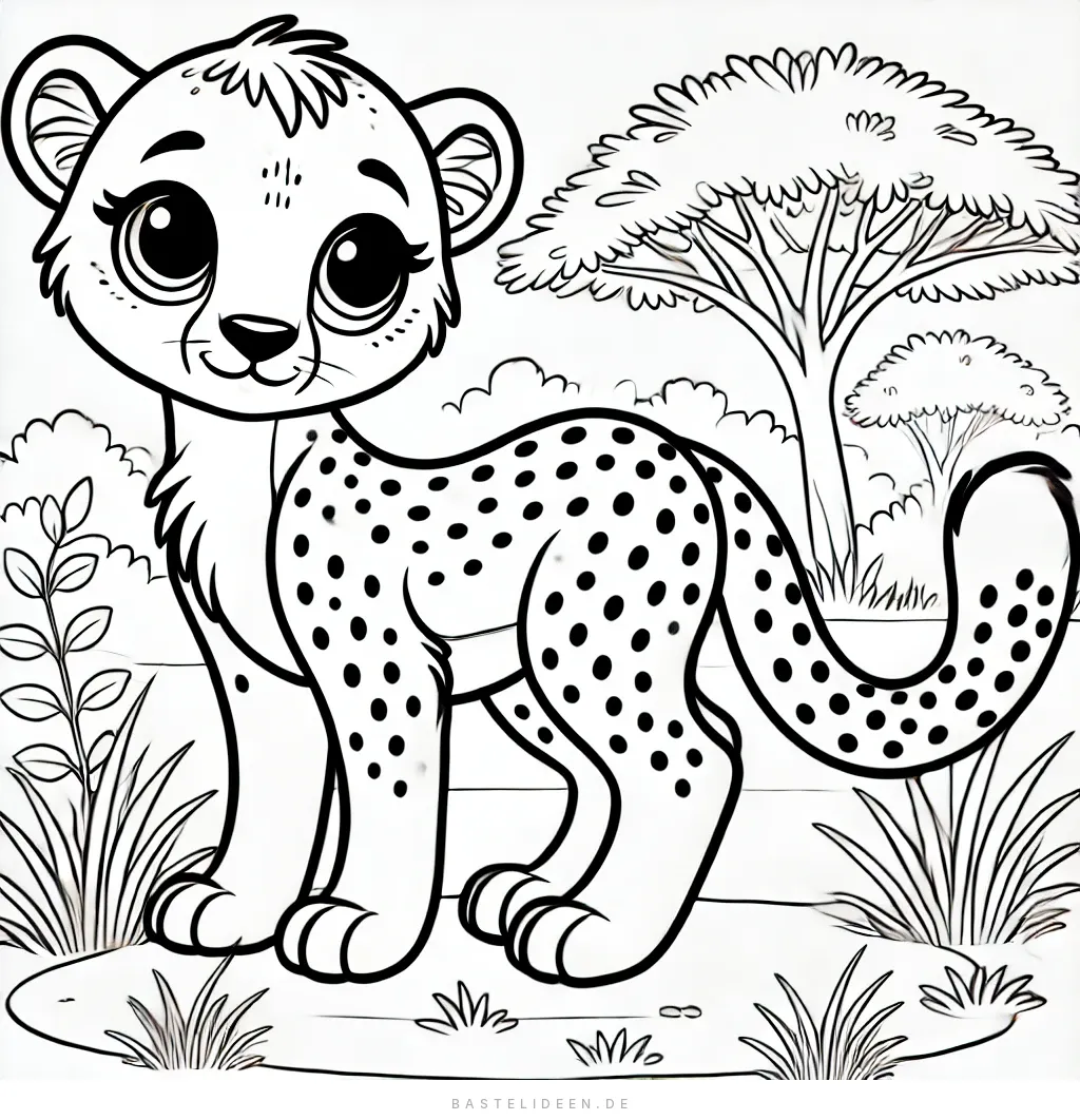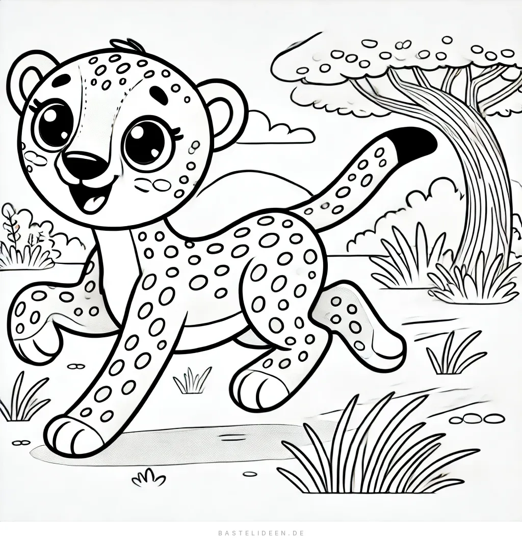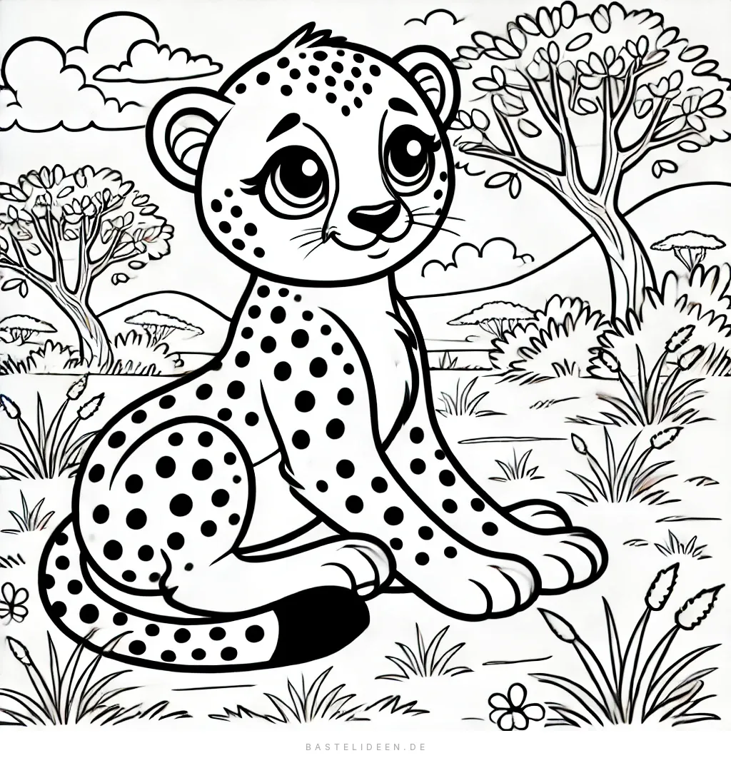 Diese niedliche Gepard-Malvorlage zeigt einen verspielten, cartoonartigen Geparden in einer malerischen Kulisse. Mit großen, ausdrucksstarken Augen und einem charmanten Lächeln ist dieser kleine Gepard ideal für Kinder und alle, die süße Tierzeichnungen lieben.