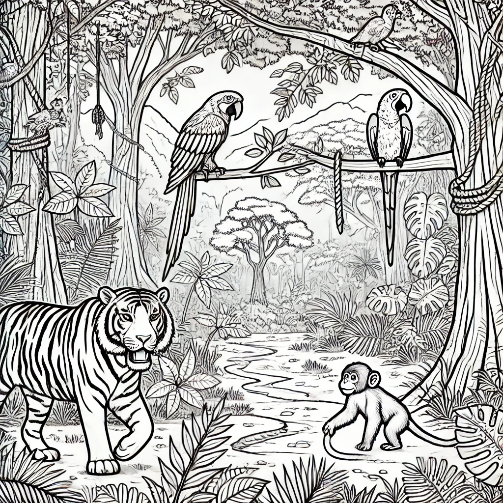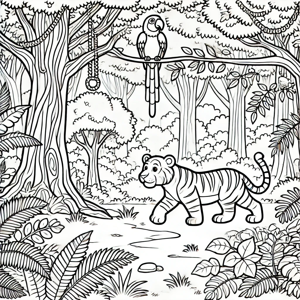 Dieses bezaubernde Ausmalbild zeigt eine lebendige Dschungelszene mit einem verspielten Tiger und einem bunten Papagei, der auf einem Ast sitzt. Das üppige Grün und die detaillierten Bäume schaffen eine reiche Umgebung.