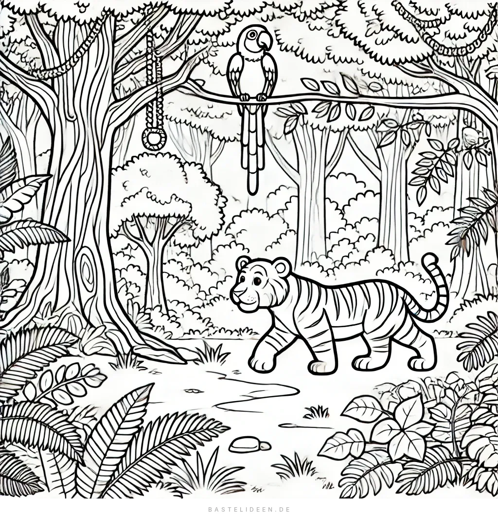 Dieses bezaubernde Ausmalbild zeigt eine lebendige Dschungelszene mit einem verspielten Tiger und einem bunten Papagei, der auf einem Ast sitzt. Das üppige Grün und die detaillierten Bäume schaffen eine reiche Umgebung.