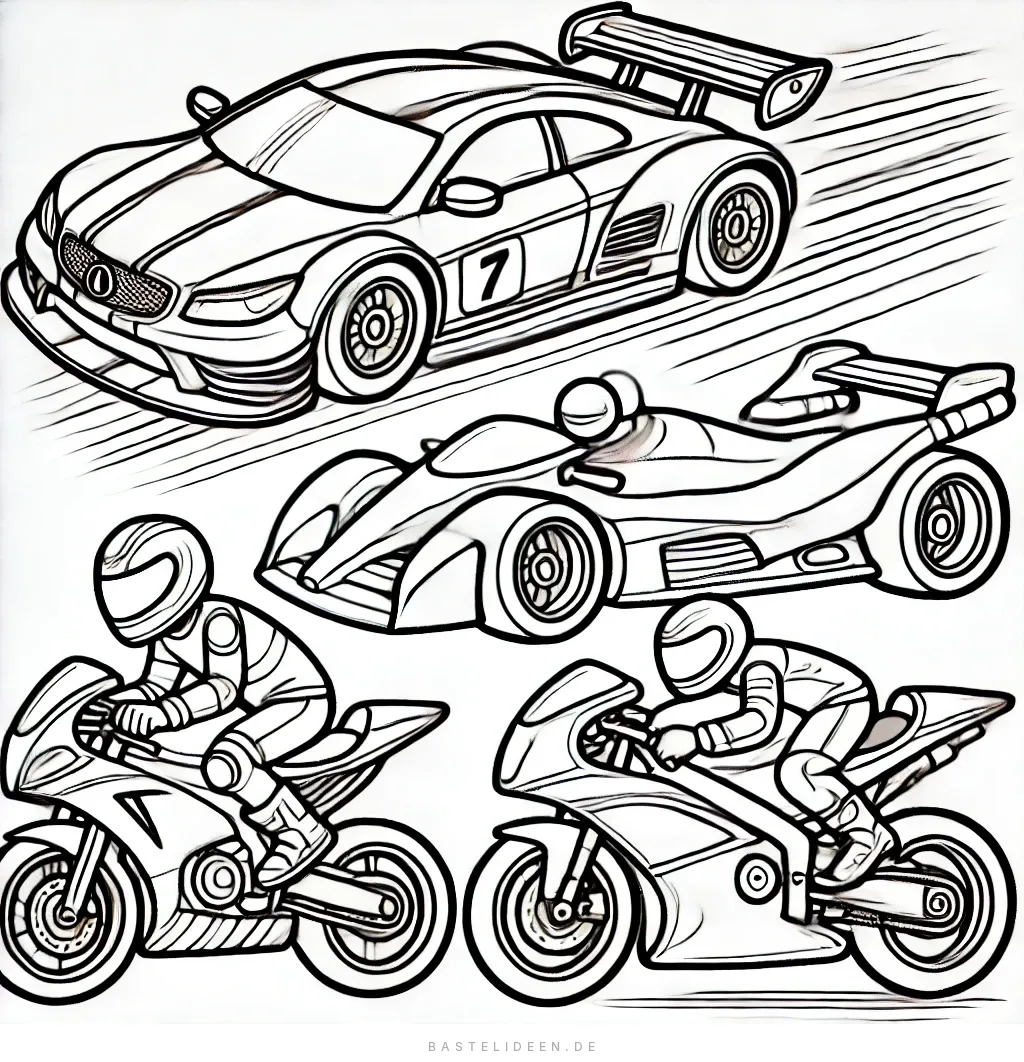 Dieses aufregende Ausmalbild zeigt eine Vielzahl von Hochgeschwindigkeits-Rennfahrzeugen, darunter ein eleganter Sportwagen, ein futuristisches Rennauto und zwei kraftvolle Motorräder.