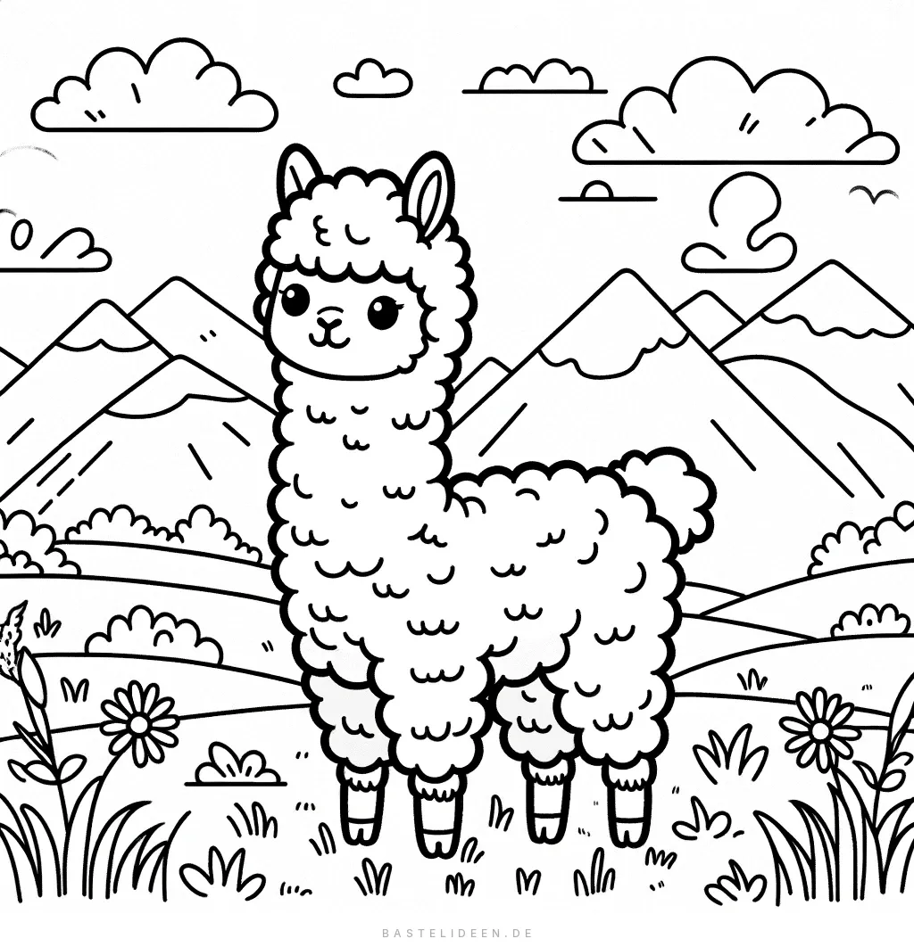 Dieses bezaubernde Ausmalbild zeigt ein niedliches Alpaka, das in einer malerischen Berglandschaft steht. Das flauschige Alpaka mit großen Augen und freundlichem Ausdruck.