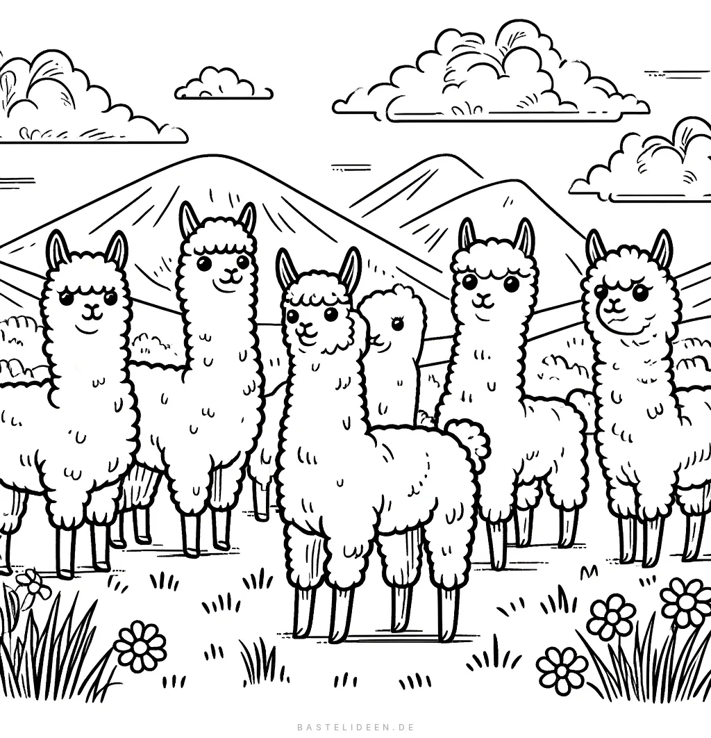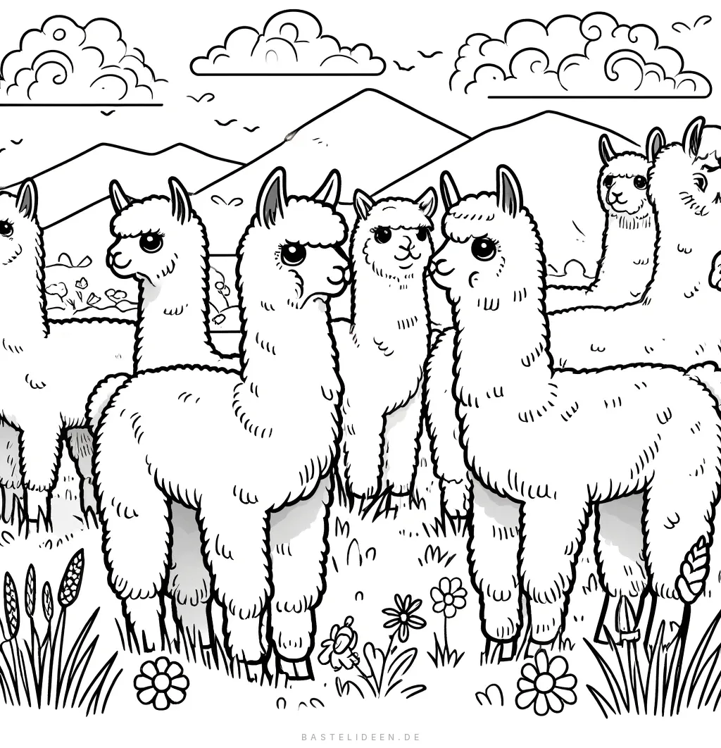 Dieses bezaubernde Ausmalbild zeigt eine entzückende Herde von Alpakas, die zusammen in einer malerischen Berglandschaft stehen, umgeben von sanften Hügeln und blühenden Blumen.