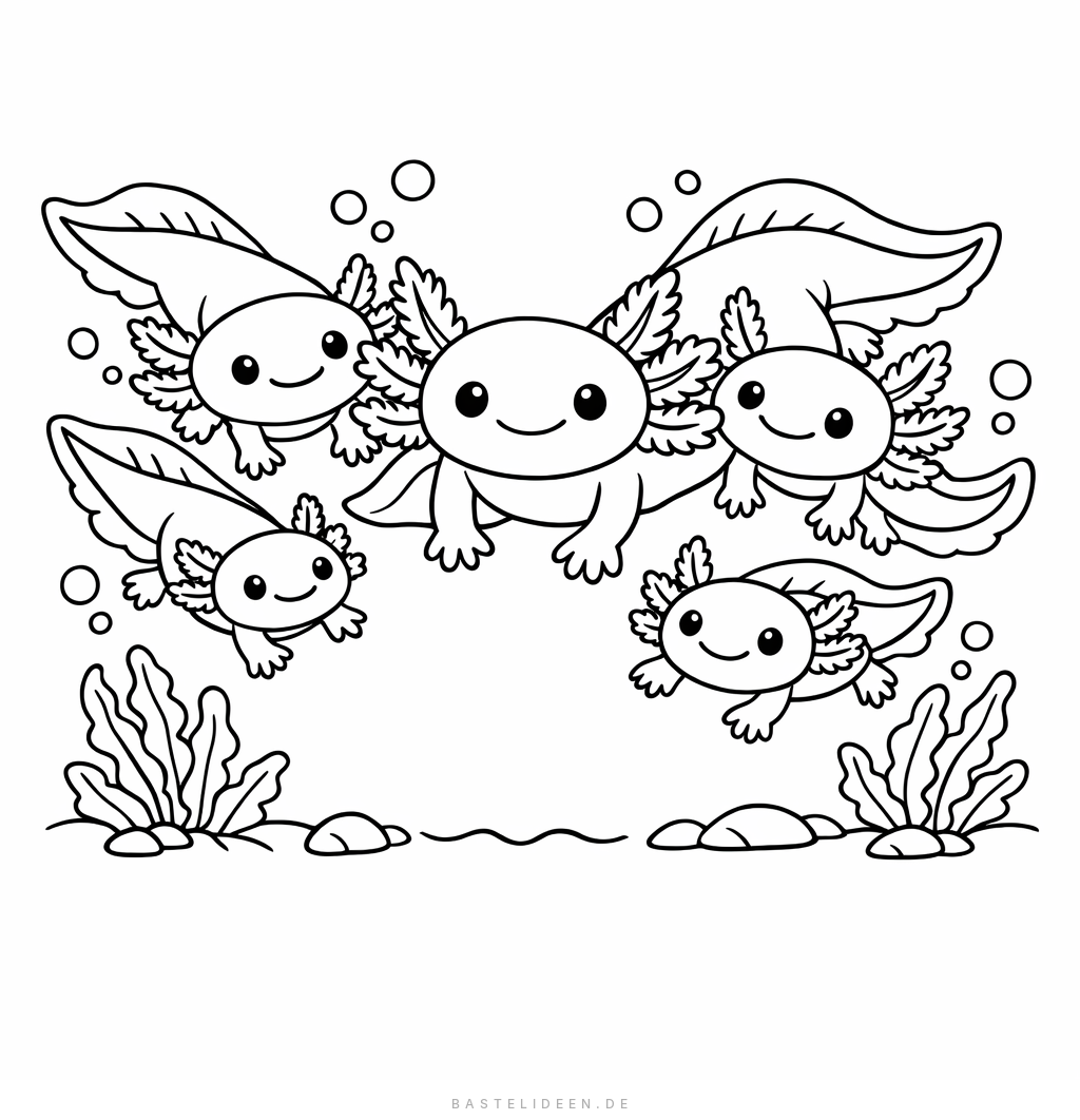 Drucke deine Lieblings-Axolotls aus und male sie in deinen Lieblingsfarben - traditionell pink, aber auch blau, weiß oder gold!