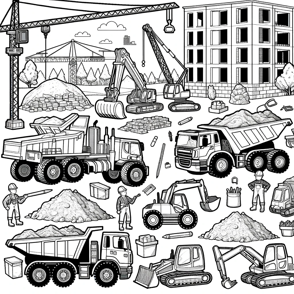 Dieses fesselnde Ausmalbild fängt das geschaeftige Treiben einer Baustelle ein. Es zeigt detaillierte Illustrationen von Bauarbeitern, die verschiedene schwere Maschinen bedienen.