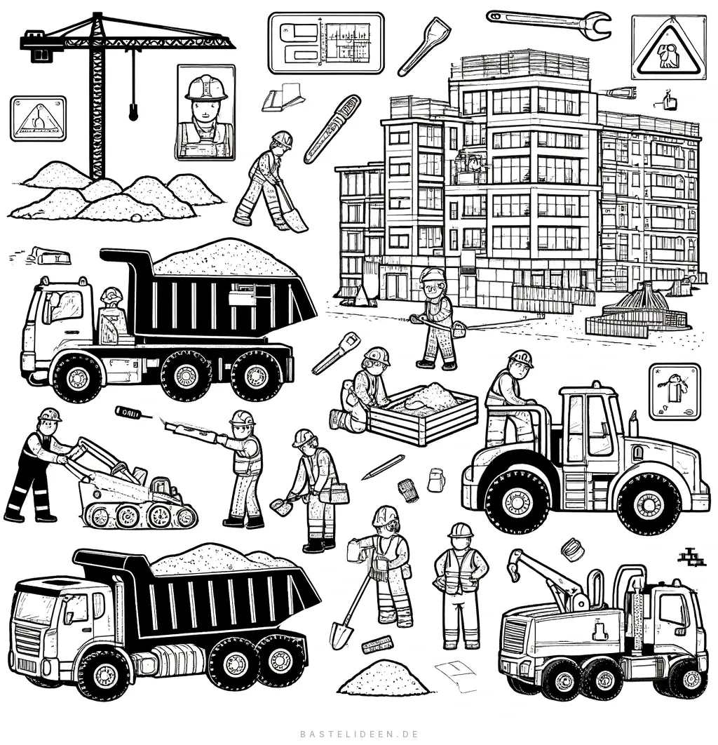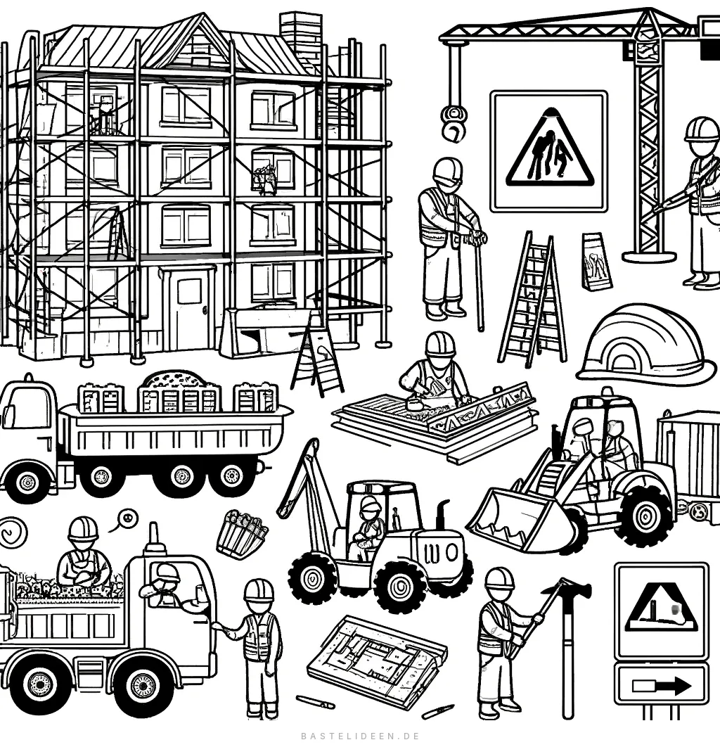 Von Baggern und Kränen bis hin zu Bauarbeitern und Werkzeugen sind diese Illustrationen perfekt für Kinder und Erwachsene gleichermaßen. Beginne noch heute dein Malabenteuer und erwecke die dynamische Welt der Baustellen mit lebendigen Farben zum Leben!