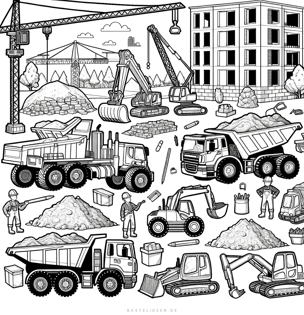 Dieses detaillierte Ausmalbild zeigt eine geschäftige Baustelle voller schwerer Maschinen und Bauarbeiter. Du findest Kräne, Kipplaster, Bagger und Planierraupen neben Materialhaufen.
