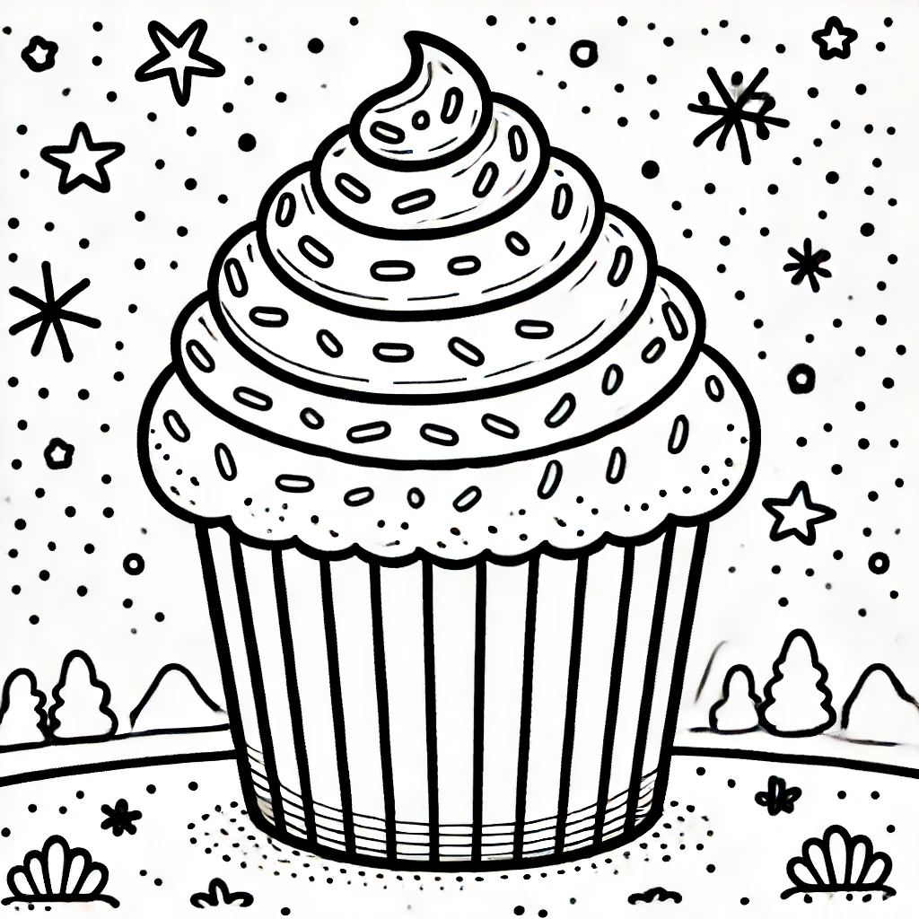 Dieses entzückende Ausmalbild zeigt einen großen, koestlich aussehenden Cupcake, der mit Wirbeln aus Zuckerguss und kleinen Streuseln bedeckt ist. Der Hintergrund ist mit Sternen gefüllt.
