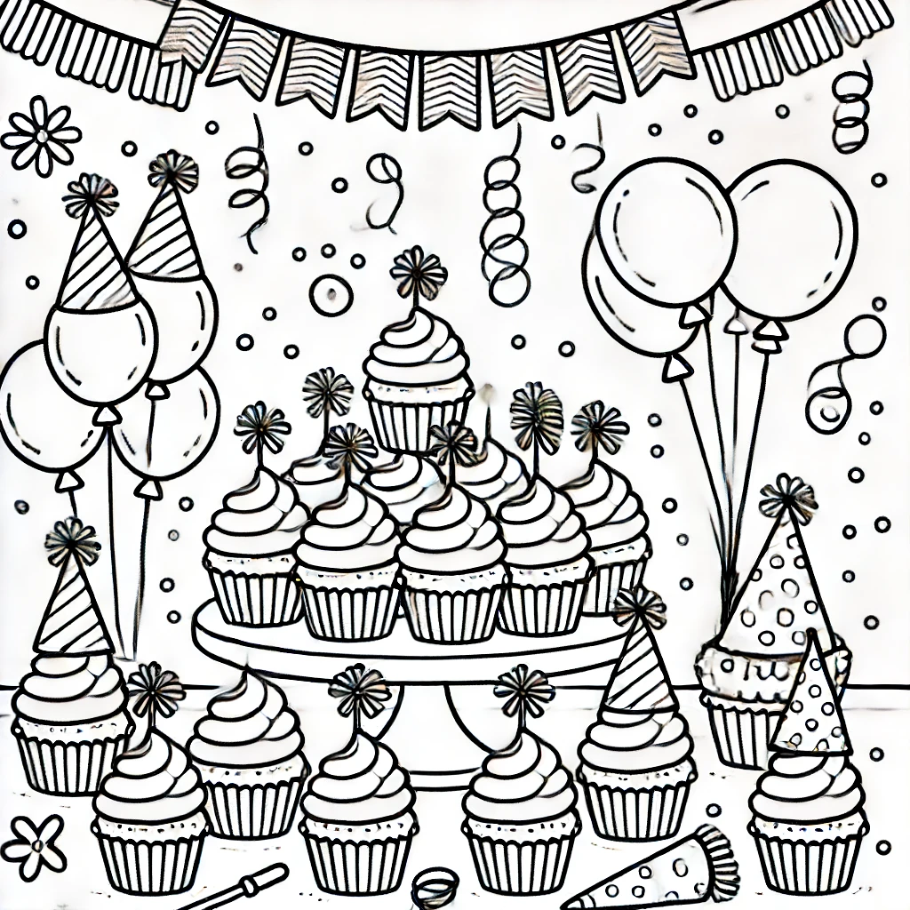 Dieses entzückende Ausmalbild zeigt eine festliche Cupcake-Party-Szene, komplett mit einem mehrstoeckigen Staender von wunderschön dekorierten Cupcakes, Ballons und Parthueten.