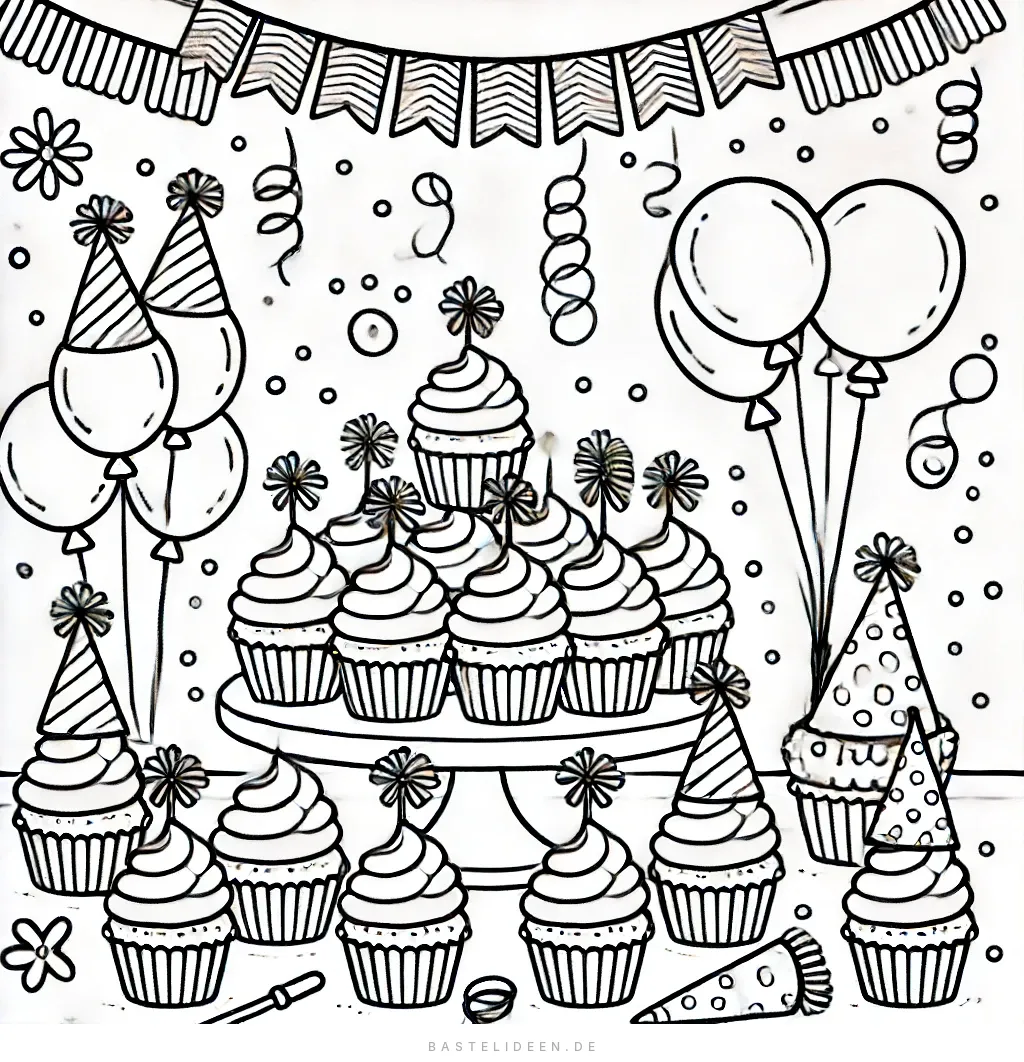 Dieses entzückende Ausmalbild zeigt eine festliche Cupcake-Party-Szene, komplett mit einem mehrstöckigen Ständer von wunderschön dekorierten Cupcakes, Ballons und Parthüten.
