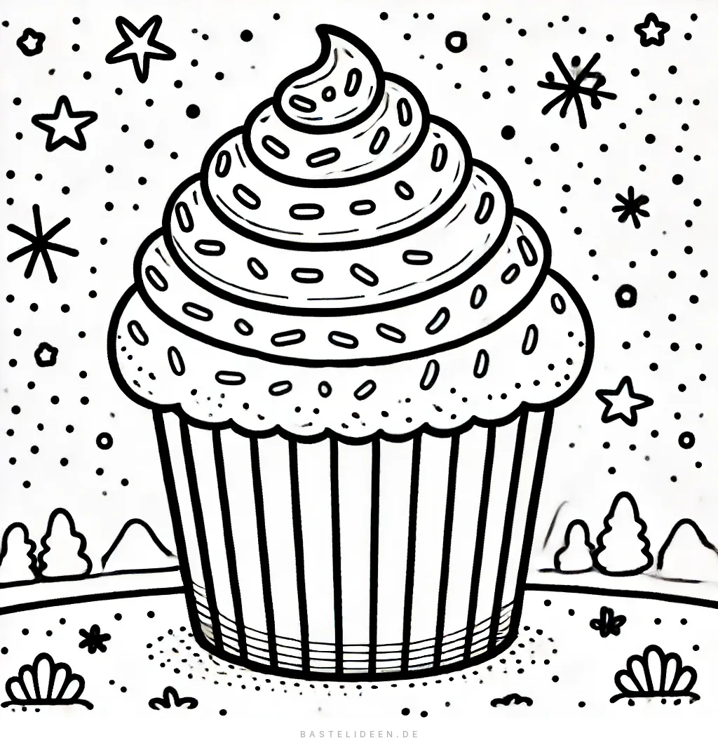 Dieses entzückende Ausmalbild zeigt einen großen, köstlich aussehenden Cupcake, der mit Wirbeln aus Zuckerguss und kleinen Streuseln bedeckt ist. Der Hintergrund ist mit Sternen gefüllt.