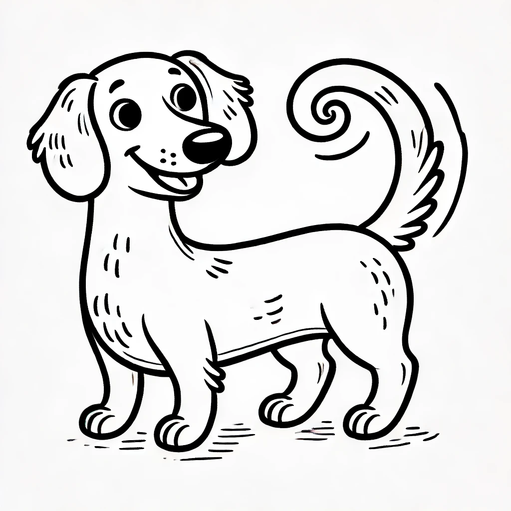 Dieses entzückende Ausmalbild zeigt einen fröhlichen Dackel mit einem wedelnden Schwanz, der Glück und Verspieltheit ausstrahlt. Das einfache, aber charmante Design ist perfekt für Kinder und Erwachsene, die Hunde lieben und gerne ausmalen.