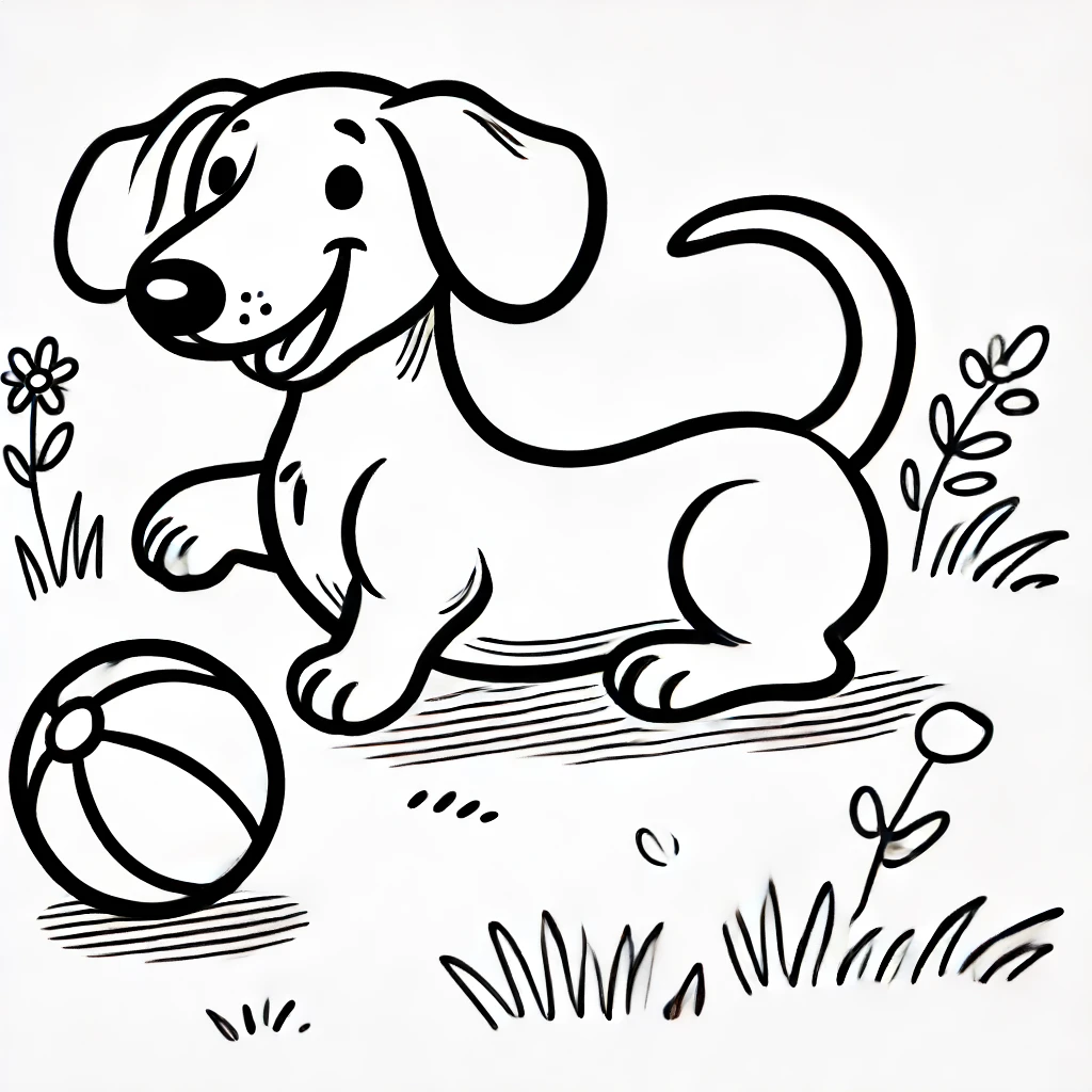 Dieses entzückende Ausmalbild zeigt einen verspielten Dackel, der einen sonnigen Tag draußen mit einem Ball genießt. Der Dackel hat einen freudigen Ausdruck, der den Spaß und die Aufregung perfekt einfängt.