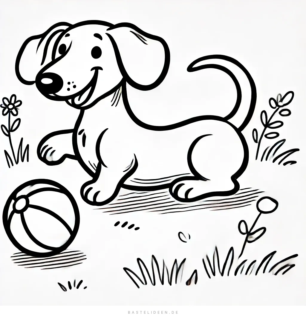Dieses entzückende Ausmalbild zeigt einen verspielten Dackel, der einen sonnigen Tag draußen mit einem Ball genießt. Der Dackel hat einen freudigen Ausdruck, der den Spaß und die Aufregung perfekt einfängt.