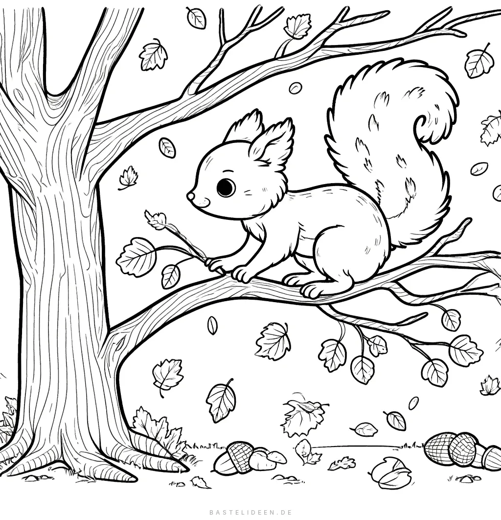 Für Kinder ab 6 Jahren: Detailliertere Vorlagen mit herbstlichen Szenen, bei denen Eichhörnchen zwischen Blättern spielen oder Nüsse für den Winter sammeln.