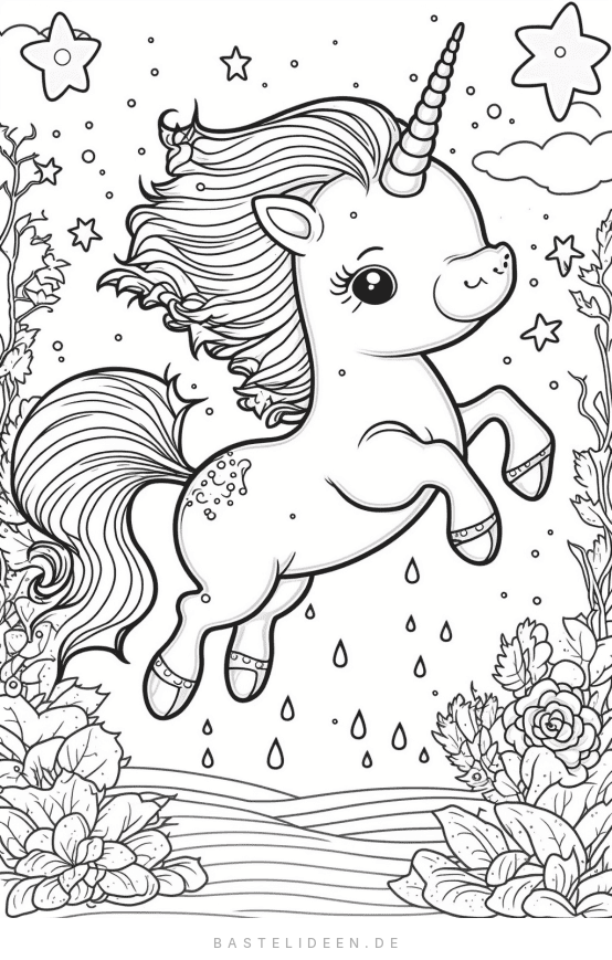 Tauche ein in eine Welt voller Fantasie mit unserem hinreißenden Einhorn-Malvorlage, das ein ausgelassen springendes Einhorn unter funkelnden Sternen zeigt. Dieses magische Wesen, mit seiner wehenden Mähne und dem glitzernden Schweif, lädt Kinder und Erwachsene gleichermaßen dazu ein, ihm Leben einzuhauchen.