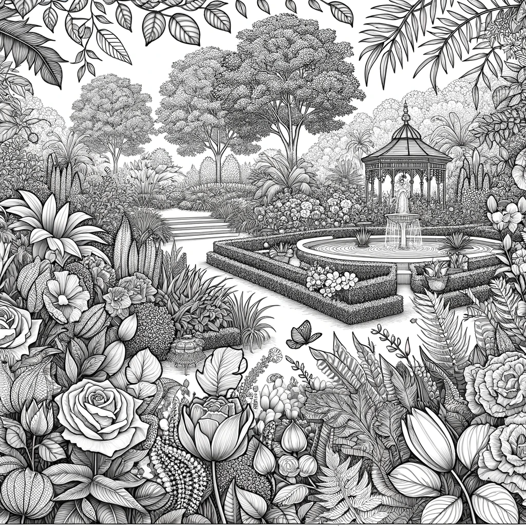 Detailreiche Gartenszene mit klassischem Springbrunnen, Pavillon und vielfältigen Blumenmustern zum Entspannen.