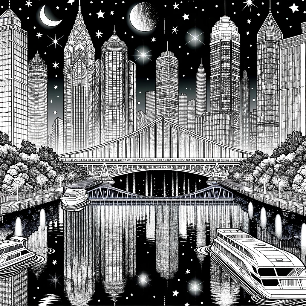 Detaillierte Stadtlandschaft bei Nacht mit Wolkenkratzern, Brücke und Booten unter Sternenhimmel.