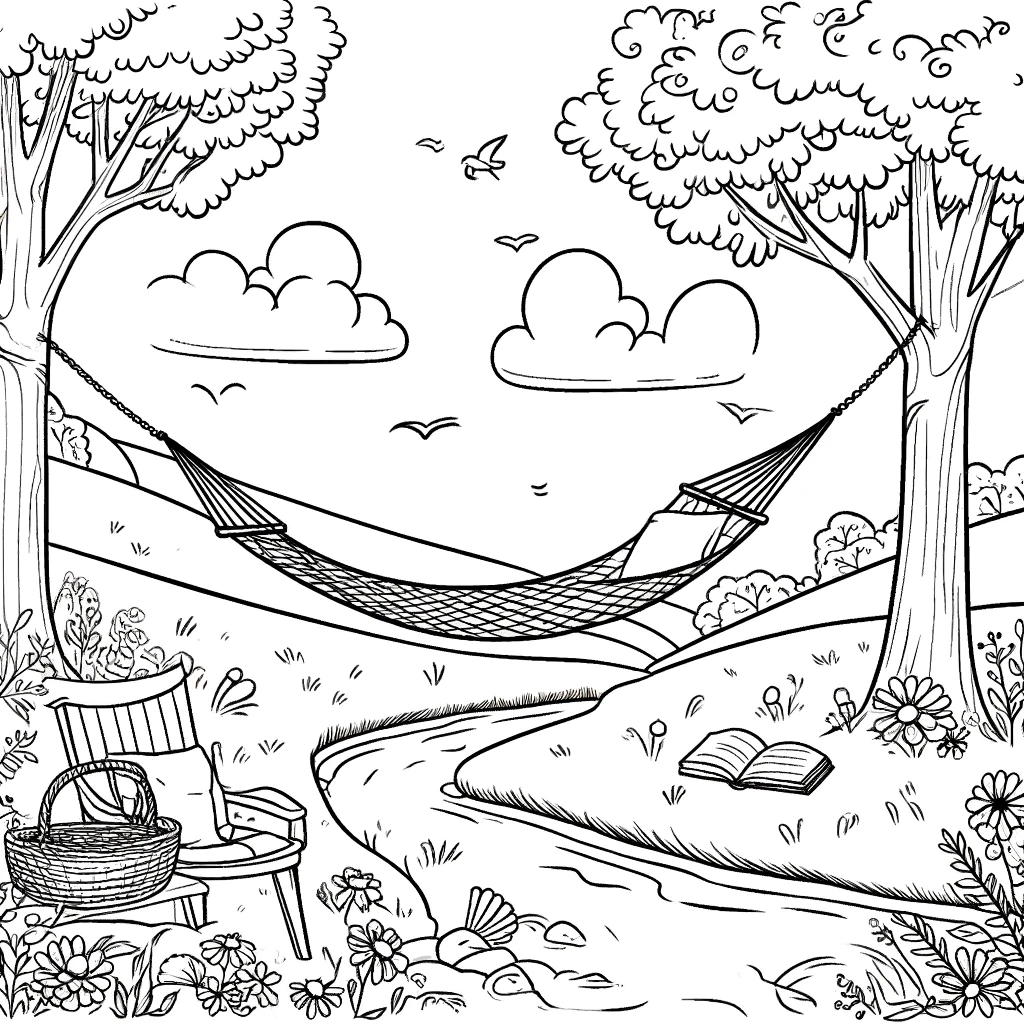 Dieses ruhige Ausmalbild zeigt eine entspannende Outdoor-Szene, die perfekt zum Abschalten ist. Eine Hängematte schwingt sanft zwischen zwei Bäumen und lädt dich ein, ein friedliches Nickerchen zu machen.