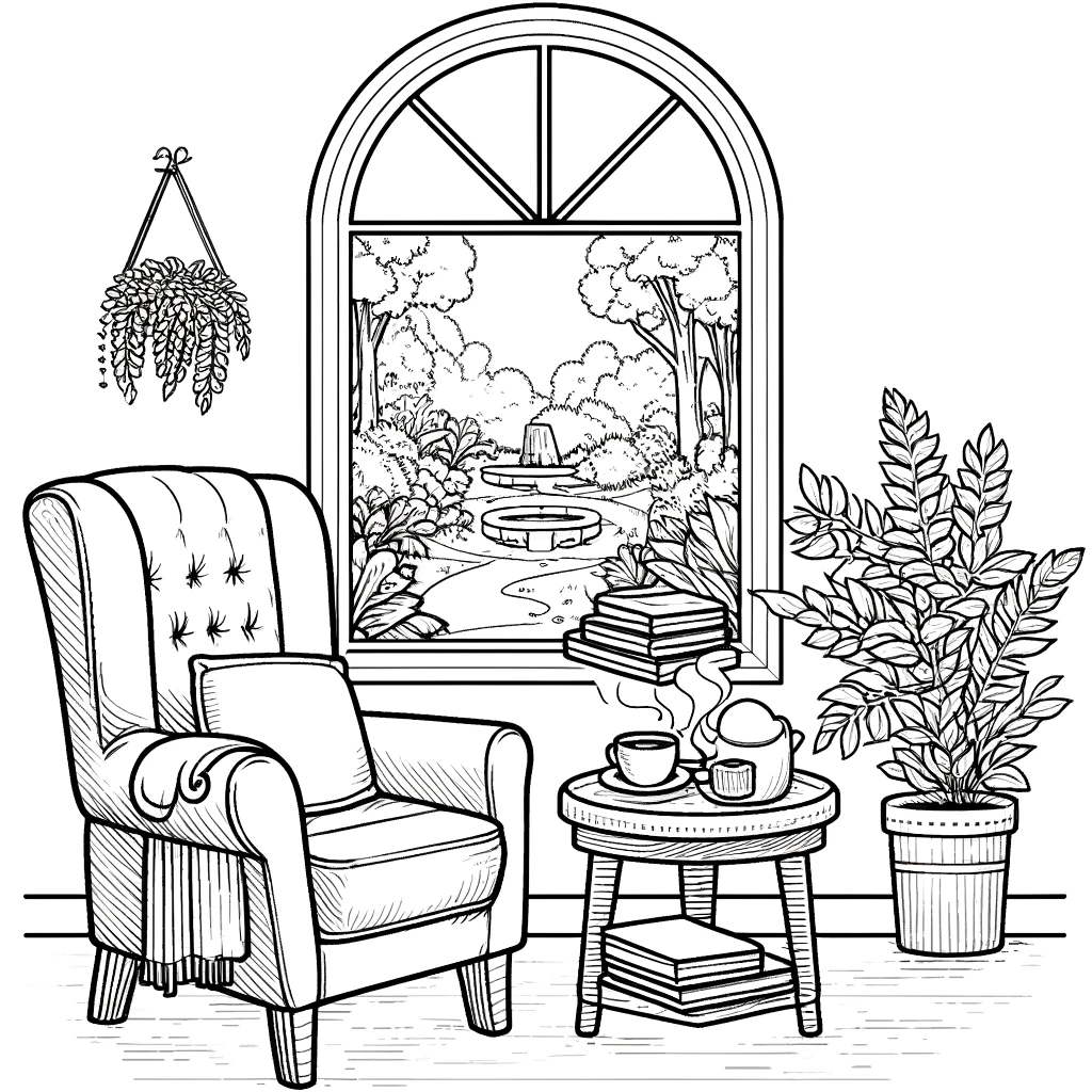 Dieses bezaubernde Ausmalbild zeigt eine gemütliche Leseecke mit Blick auf einen wunderschönen Garten. Ein einladender Sessel steht am Fenster und bietet einen Ausblick auf eine ruhige Außenszene mit einem Brunnen und üppigem Grün.