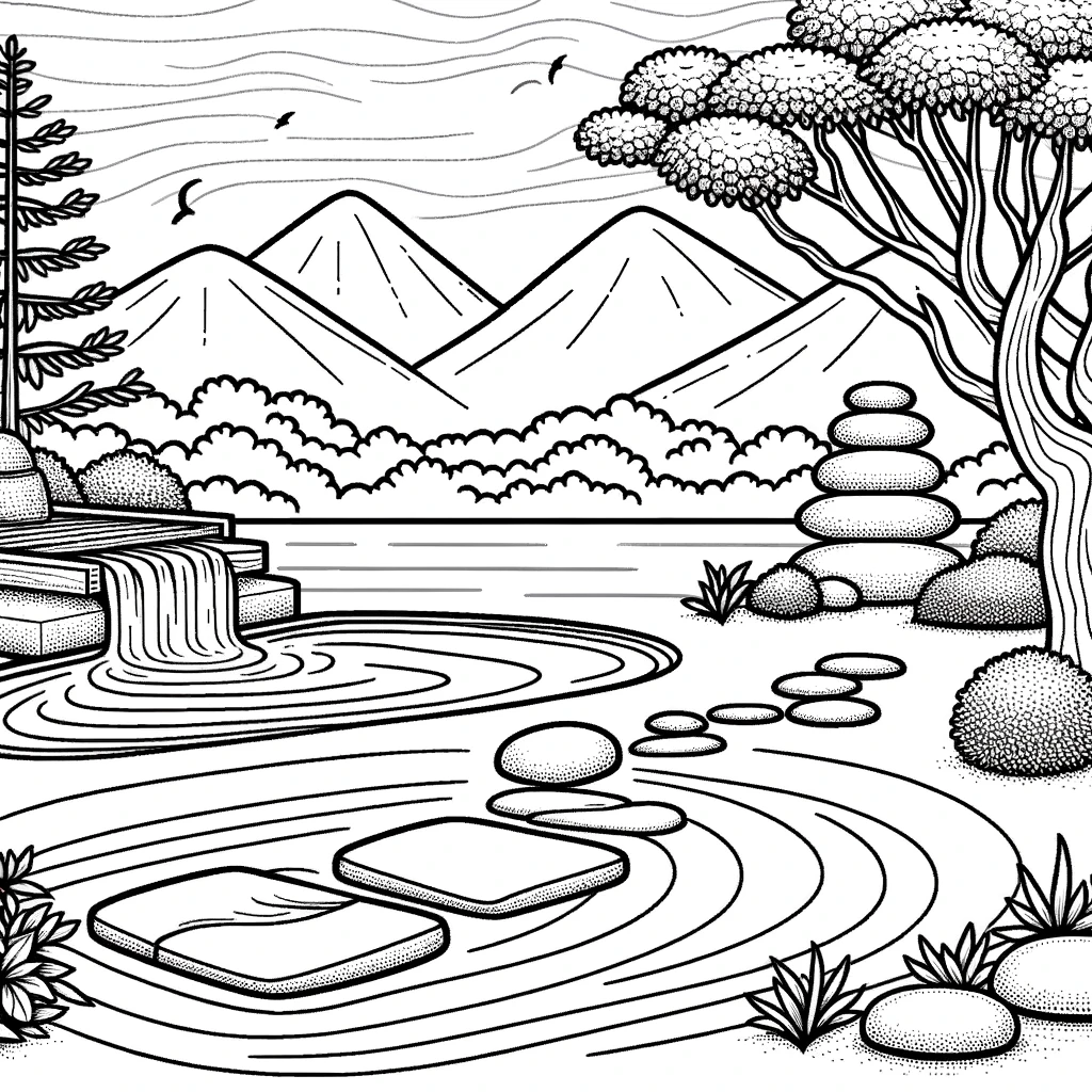 Dieses friedliche Ausmalbild zeigt eine ruhige Zen-Garten-Szene, die zur Entspannung und Meditation einlädt. Im Vordergrund führen Trittsteine über einen ruhigen, wellenförmigen Teich zu einem friedlichen Wasserfall, der über glatte Felsen fließt.