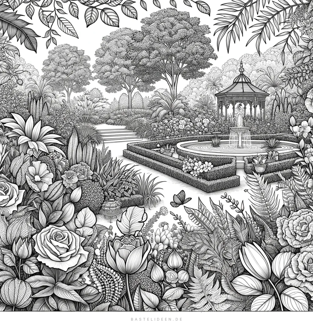 Detailreiche Gartenszene mit klassischem Springbrunnen, Pavillon und vielfältigen Blumenmustern zum Entspannen.