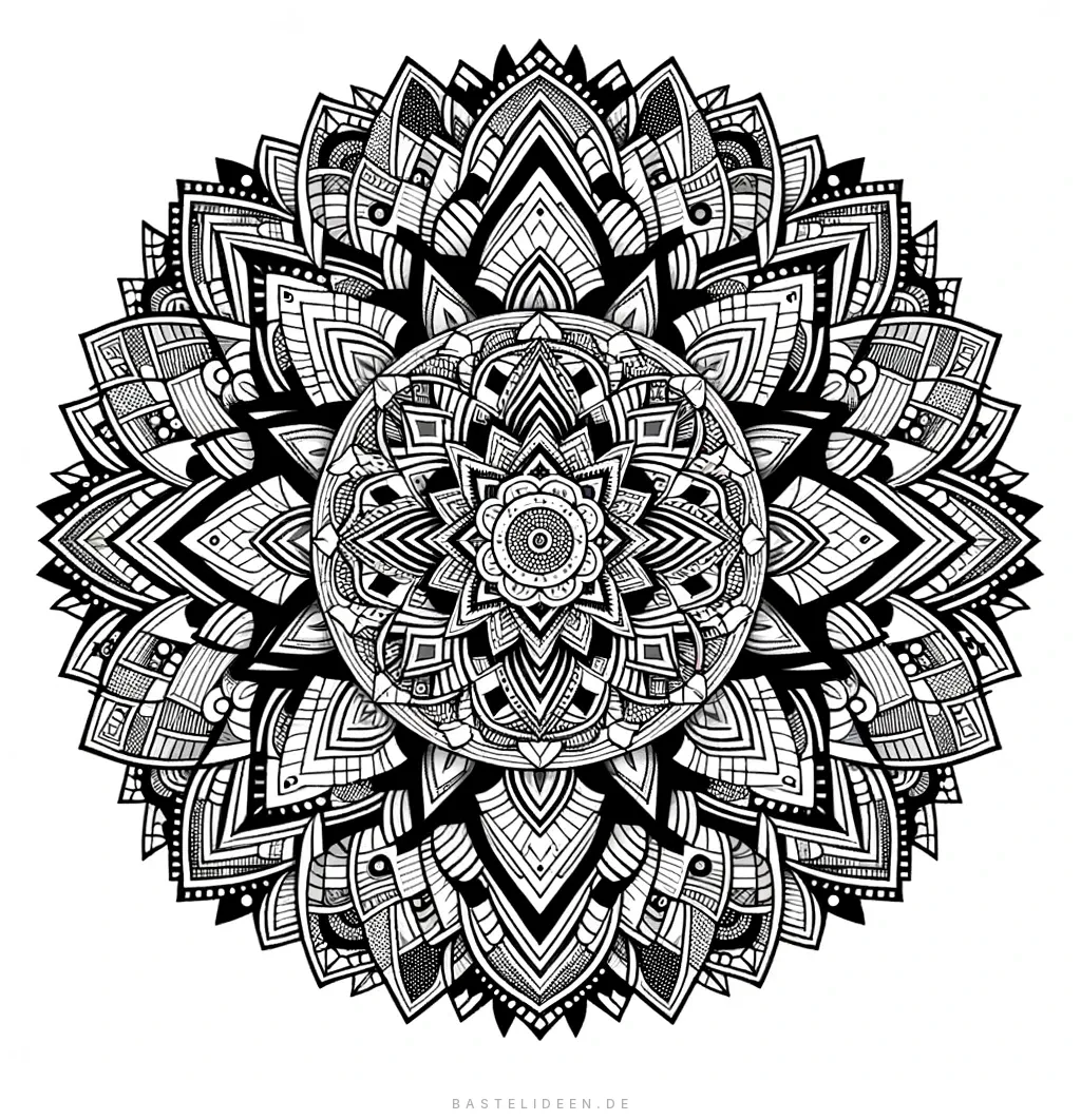 Aufwendiges symmetrisches Mandala mit komplexen geometrischen Mustern für meditative Entspannung.