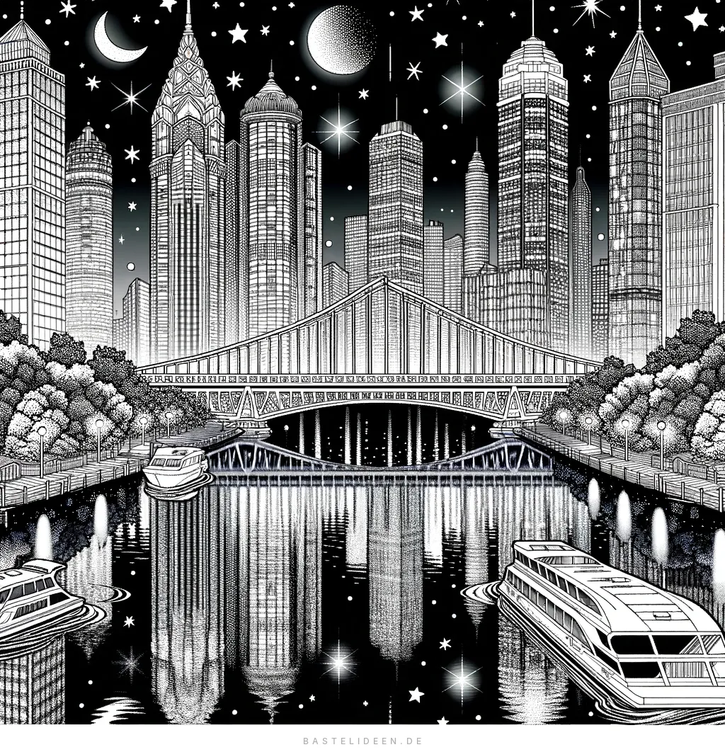 Detaillierte Stadtlandschaft bei Nacht mit Wolkenkratzern, Brücke und Booten unter Sternenhimmel.