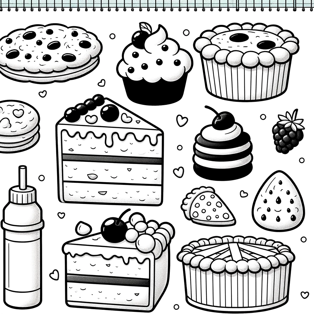Dieses bezaubernde Ausmalbild zeigt eine Auswahl köstlicher Desserts, perfekt für alle Naschkatzen. Die Seite enthält eine Vielzahl köstlicher Leckereien, darunter Cupcakes, Torten, Kuchen und Kekse.