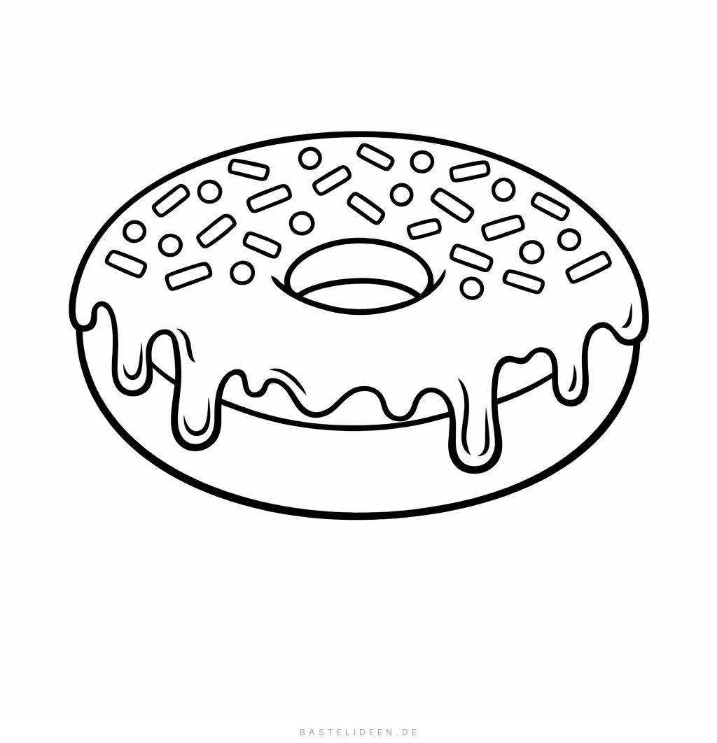 Appetitliches Ausmalbild mit einem großen Donut mit tropfender Glasur und bunten Streuseln.