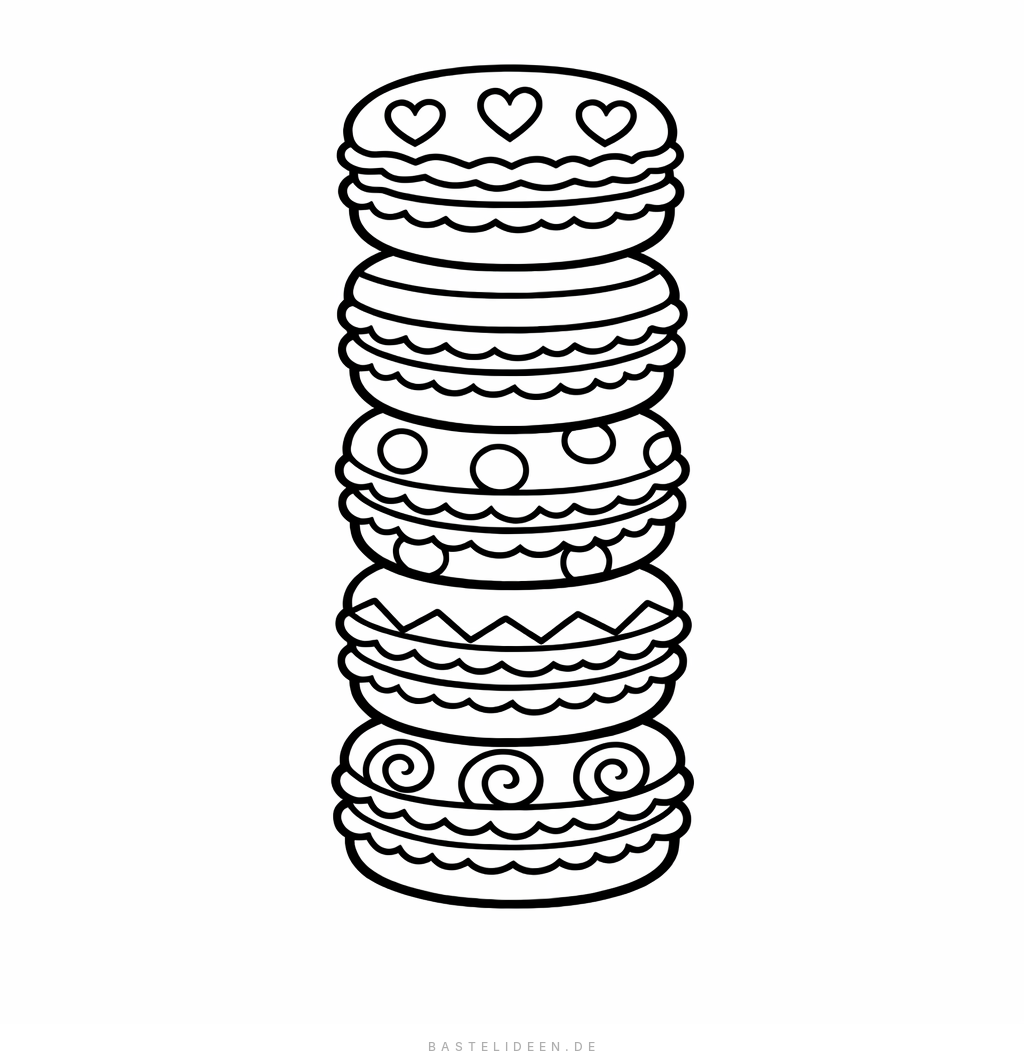 Elegantes Ausmalbild mit fünf gestapelten Macarons mit verschiedenen Mustern.