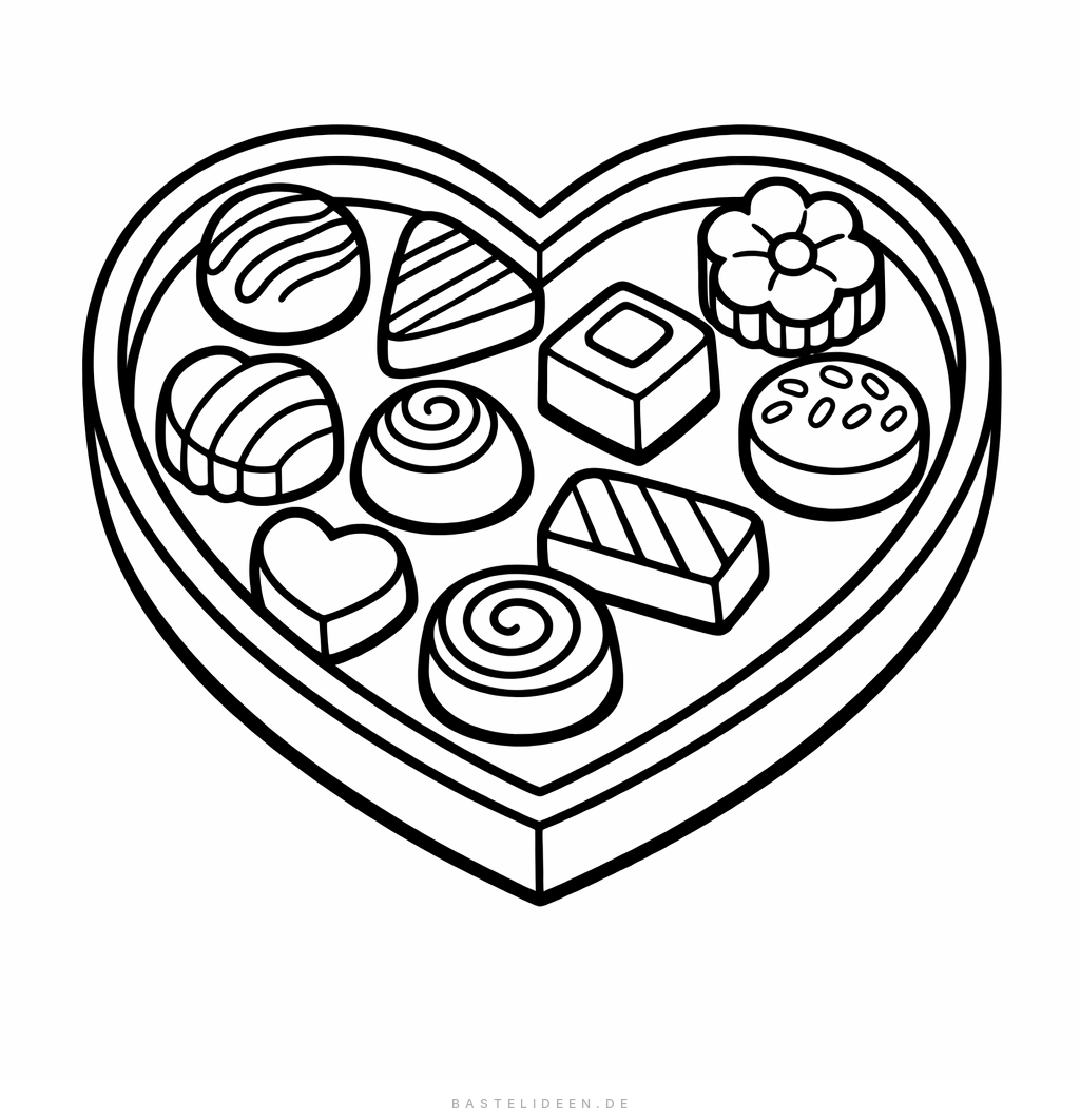 Süßes Ausmalbild mit einer herzförmigen Pralinenschachtel voller verschiedener Pralinen.
