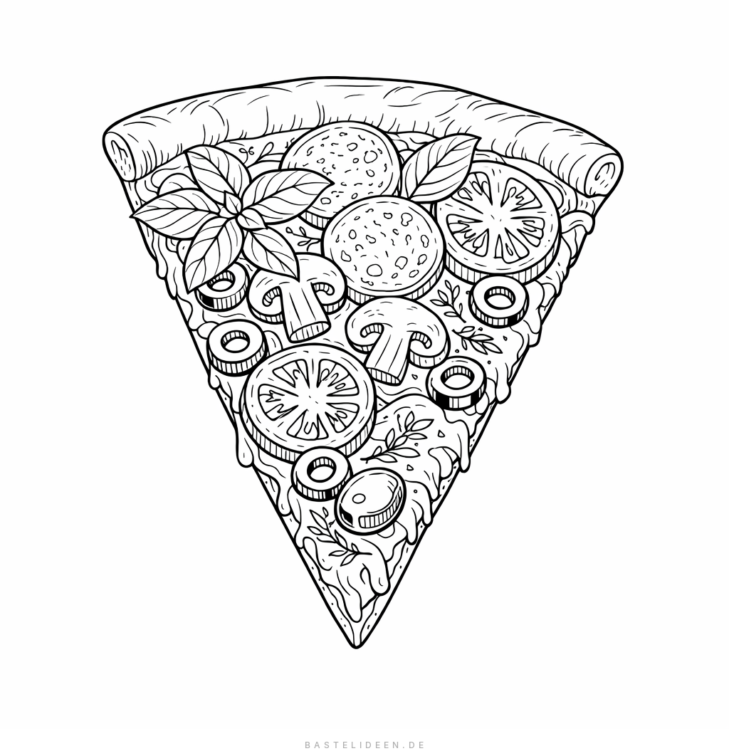 Leckeres Pizza-Ausmalbild mit verschiedenen Toppings, ideal für Kinder ab 6 Jahren.