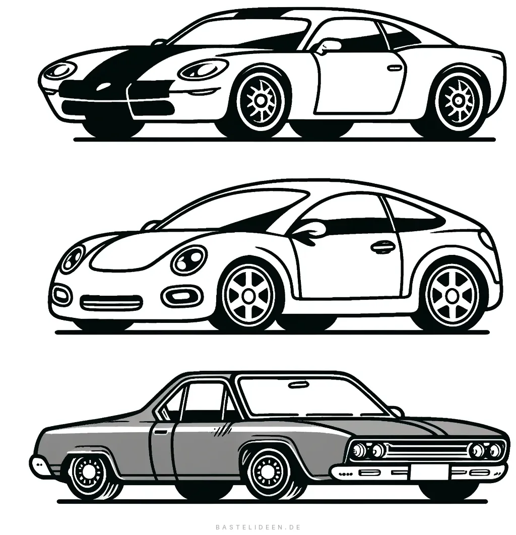 Dieses faszinierende Ausmalbild zeigt eine Vielzahl von Autodesigns, von schlanken, modernen Sportwagen bis hin zu klassischen Vintage-Autos. Das Bild präsentiert drei unterschiedliche Autos, jedes mit einzigartigen Details.