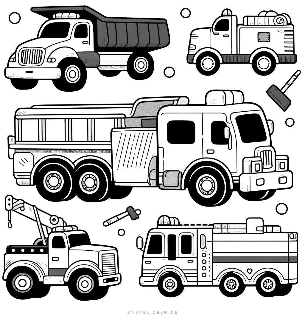 Dieses dynamische Ausmalbild zeigt eine Vielzahl kraftvoller LKWs, darunter einen Kipper, ein Feuerwehrauto, ein Abschleppfahrzeug und mehr. Jeder LKW ist mit einzigartigen Details versehen.