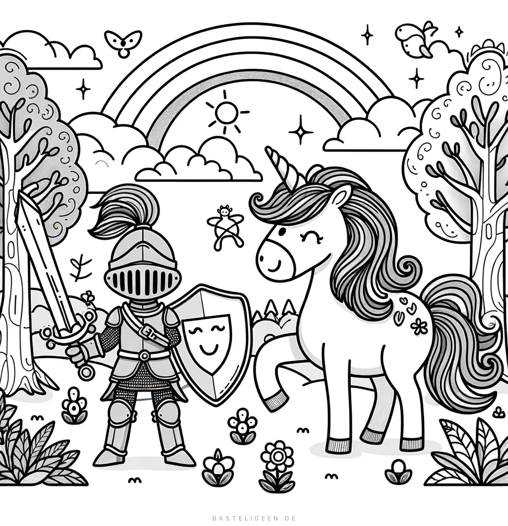 Diese bezaubernde Ausmalbild zeigt einen tapferen Ritter, der stolz neben einem majestätischen Einhorn in einer magischen Waldlandschaft steht. Der Ritter trägt glänzende Rüstung mit Schwert und Schild.
