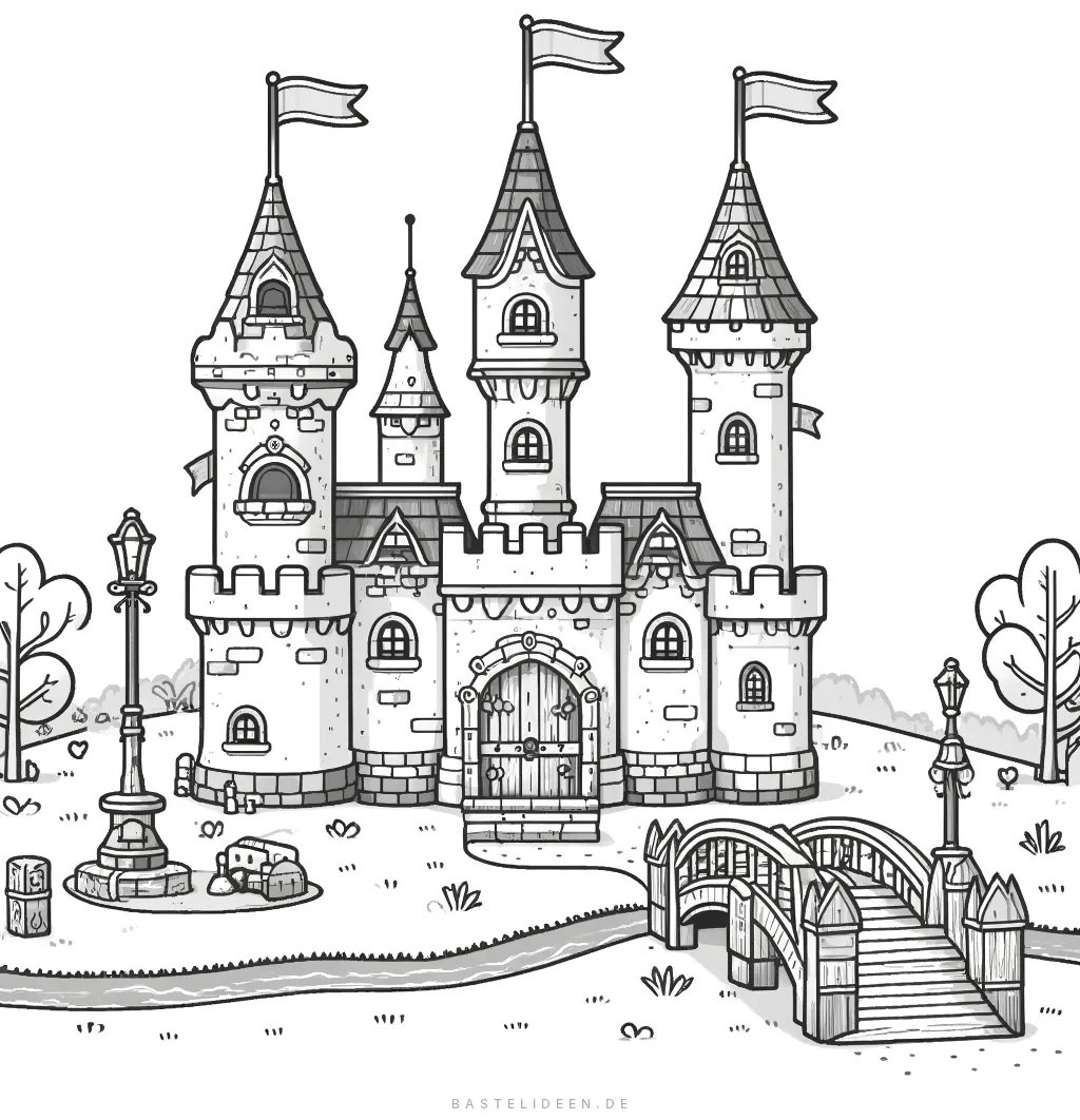 Diese fesselnde Ausmalbild zeigt ein prächtiges Schloss mit hohen Türmen, wehenden Fahnen und einer charmanten Brücke, die einen sanften Bach überquert. Die Szene vermittelt ein Gefühl von Märchenzauber.