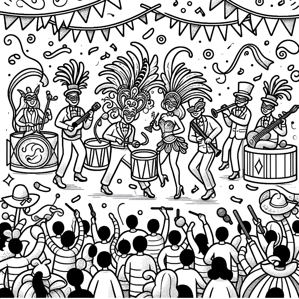 Lebhafter Karnevalsumzug mit Sambaband, Taenzern und Konfetti zum Ausmalen.