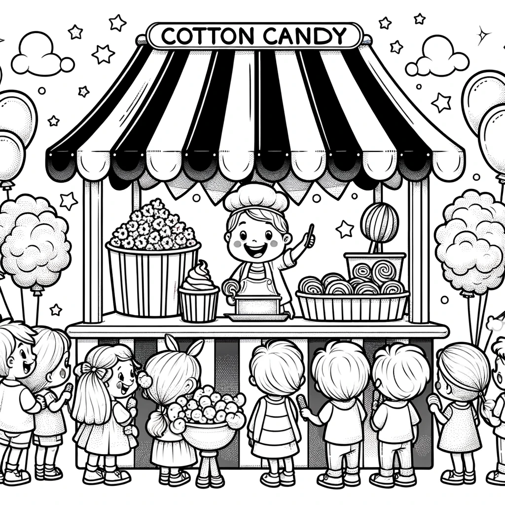 Fröhlicher Zuckerwatte-Stand mit Kindern auf einem Karnevalsfest zum Ausmalen.