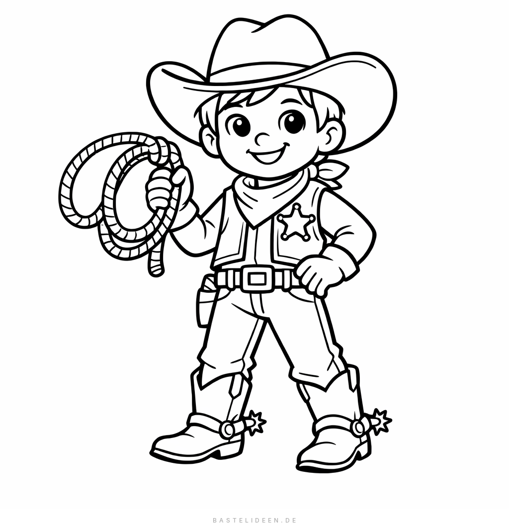 Ein abenteuerlustiges Kind im Cowboykostüm mit Cowboyhut, Sheriffstern und Lasso – ein Klassiker für Fasching und Karneval.