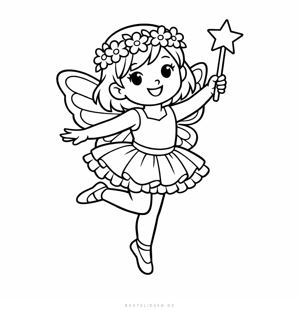 Ein zauberhaftes Kind im Feenkostüm mit Flügeln, Blumenkranz und Zauberstab – ein magisches Faschingskostüm zum Ausmalen.