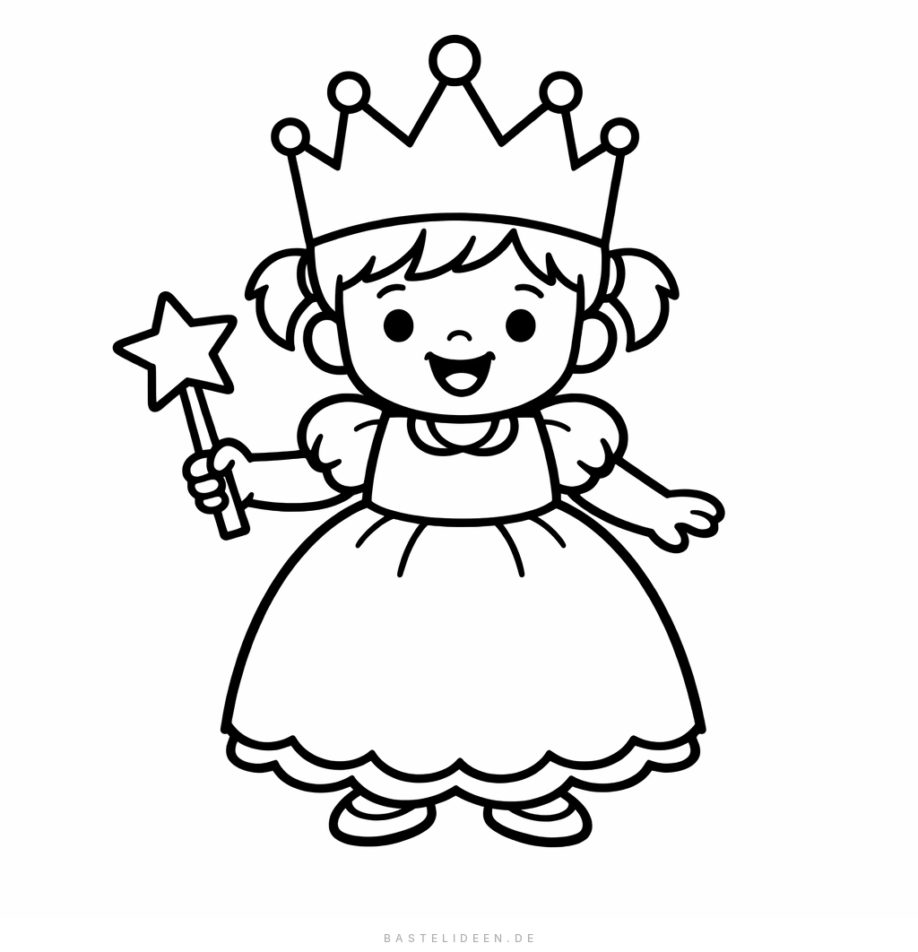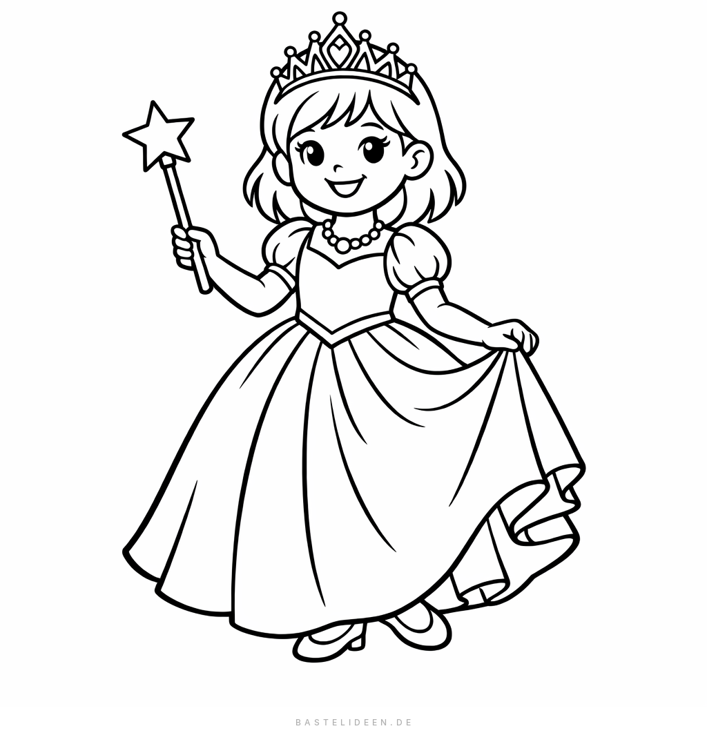 Ein Kind im eleganten Prinzessinnenkostüm mit Krone und Zauberstab – ein beliebtes Faschingskostüm zum Ausmalen.