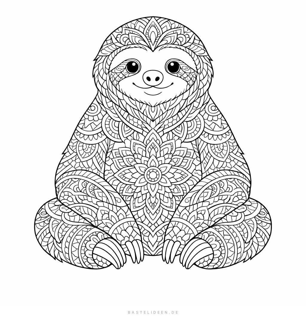 Ein kunstvolles Faultier verziert mit detaillierten Mandala-Mustern für Erwachsene.