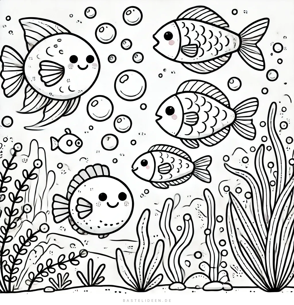 Dieses entzückende Ausmalbild zeigt eine Gruppe fröhlicher Cartoon-Fische, die glücklich zwischen Blasen und Unterwasserpflanzen schwimmen.