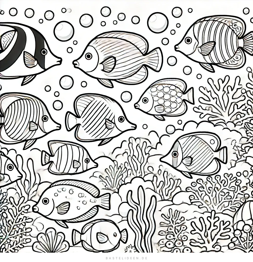 Dieses faszinierende Ausmalbild zeigt eine lebendige Unterwasserszene mit verschiedenen tropischen Fischen, die zwischen Korallenriffen und Blasen schwimmen.